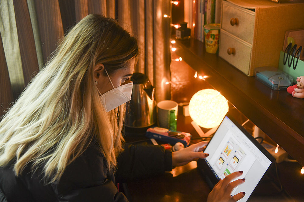 2月18日,重庆大学乌克兰籍留学生志愿者奥丽娅在设计制作引导留学生减少外出、通过线上购买生活必需品的宣传资料。 新华社记者王全超摄