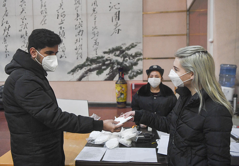 2月18日,重庆大学巴基斯坦籍留学生志愿者吉米(左)向俄罗斯籍留学生克里斯季娜发放口罩。 新华社记者王全超摄