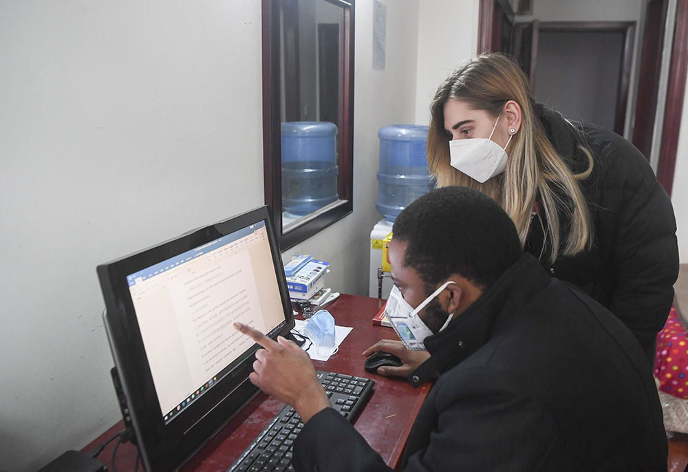 2月18日,重庆大学乌克兰籍留学生志愿者奥丽娅(右)和尼日利亚籍留学生志愿者保罗在讨论面向留学生的疫情防控宣传材料。 新华社记者王全超摄