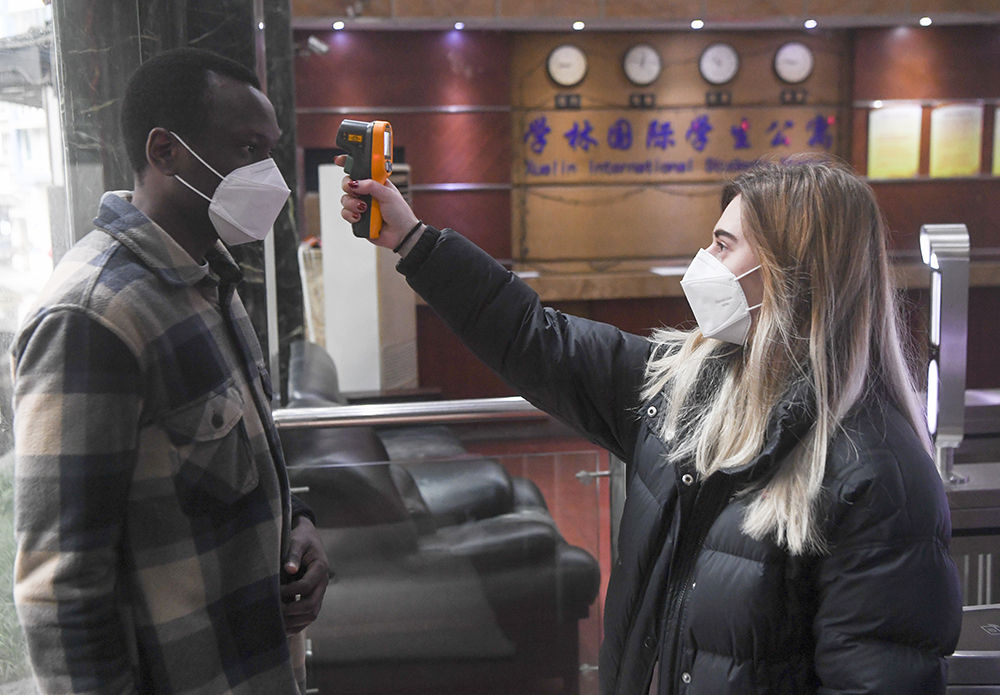 2月18日,重庆大学乌克兰籍留学生志愿者奥丽娅(右)在为进入公寓的留学生测量体温。面对新冠肺炎疫情,重庆一些高校的外国留学生志愿加入疫情防控宣传、发放口罩、卫生消毒等工作中,为校园防控疫情贡献力量。 新华社记者王全超摄影报道