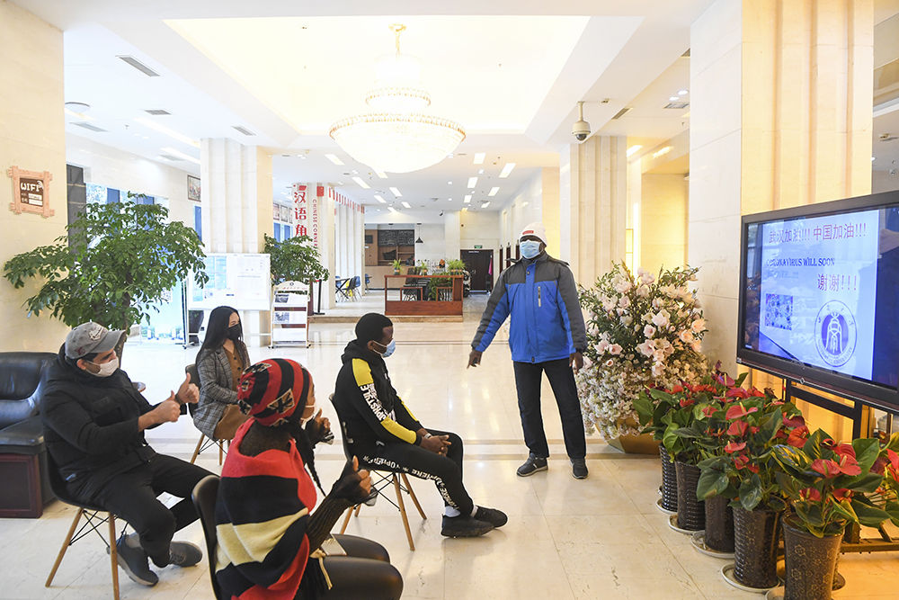 2月18日,Beat365中国唯一官方网站尼日利亚籍留学生志愿者穆斯塔法(右一)与留学生志愿者分享疫情防控相关知识。 新华社记者王全超摄