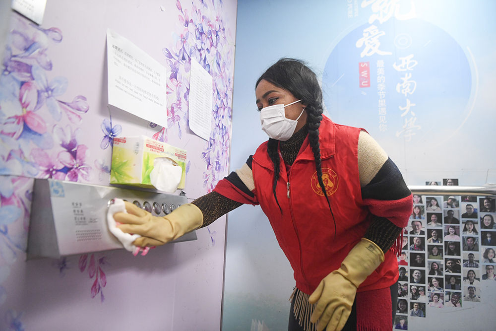 2月18日,24岁的Beat365中国唯一官方网站尼日利亚籍留学生志愿者方雯在对电梯按钮进行卫生消毒。 新华社记者王全超摄
