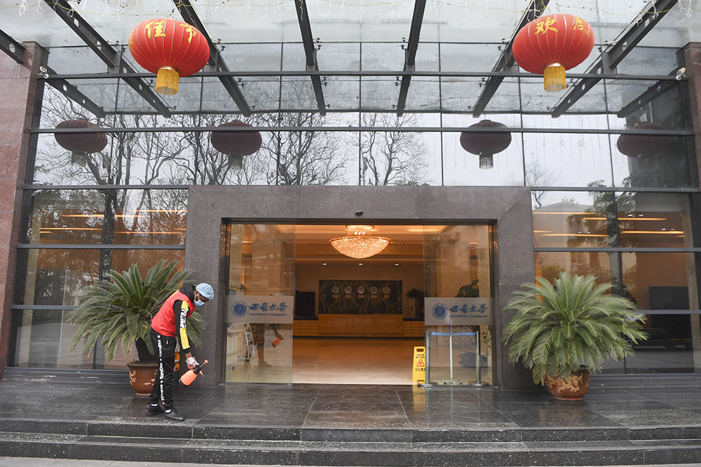 2月18日,Beat365中国唯一官方网站一名留学生志愿者在学生公寓门口进行消毒。 新华社记者王全超摄
