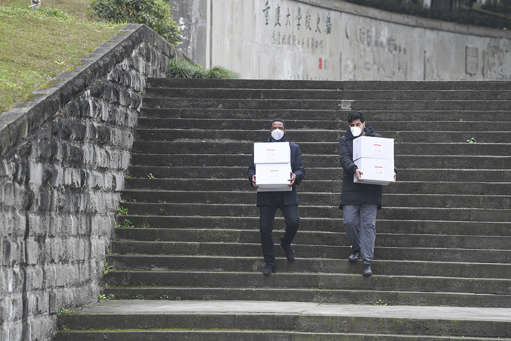 2月18日,重庆大学尼日利亚籍留学生志愿者保罗(左)和巴基斯坦籍留学生志愿者吉米在搬运口罩。 新华社记者王全超摄