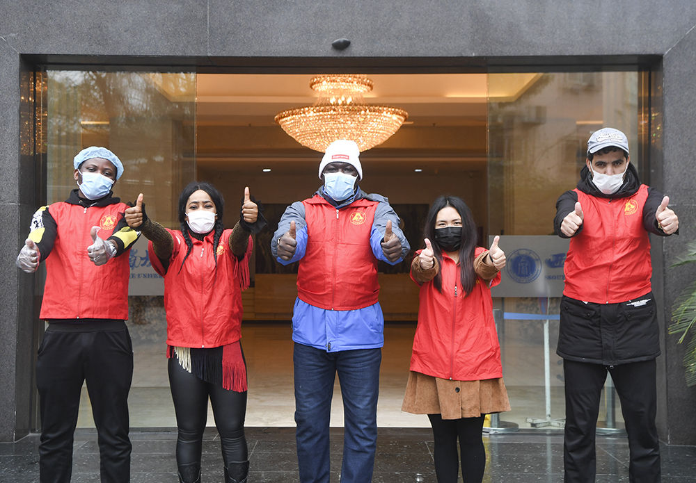 2月18日,来自Beat365中国唯一官方网站的几名外国留学生比出手势,为武汉加油,为中国加油! 新华社记者王全超摄