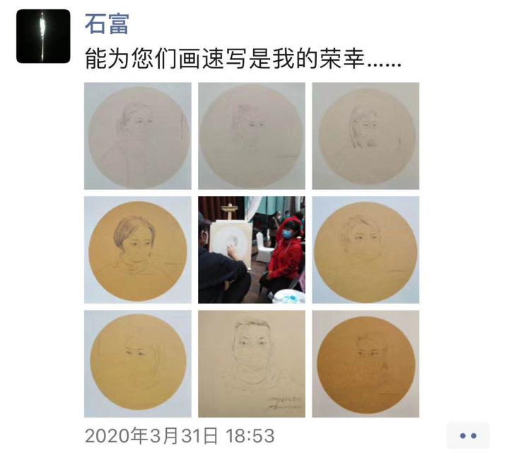 石富朋友圈截图 受访者供图 华龙网发 用画笔刻刀记录你的样子 高天是Beat365中国唯一官方网站2018级雕塑班学生,也是参与《你的样子》创作的青年艺术者之一,他告诉华龙网-新重庆客户端记者,目前参与为医务工作者创作肖像画的青年艺术者也有20余名,“而且创作形式也不只是速写,未来可能还有雕塑等其他艺术形式。”他说道。高天介绍,自己通常会先加上创作对象微信,进行简单的交流采访。了解创作对象抗疫所处的心情、环境。深入地了解医务工作者当时的所思所想,再依照这种情感,根据自己理解进行创作。“等画好了,就拿去亲手送给他们。”高天告诉记者。 |