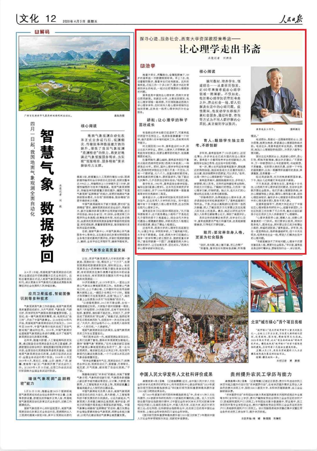 编写教材、培养学生、创建理论……从青丝到银发,近60年来黄希庭在心理学领域一路深耕。不仅如此,他还将心理学知识带到书斋之外,奔走社会一线,帮人们解决生活中的心理问题。疫情期间,他发动学生积极开展社会服务,通过科普、咨询等方式为不同人群纾解内心困扰,真正做到学以致用。