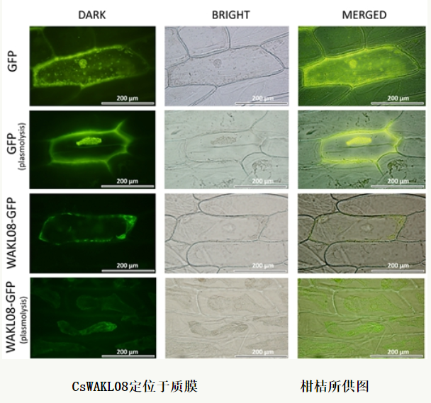 植物细胞壁关联的类受体激酶WAKL在植物对病原菌侵染的响应过程中起重要作用。病原菌侵染时,该酶可以识别细胞壁成分的变化,并将侵染信号通过跨膜结构域传递至细胞内的磷酸激酶结构域,通过对靶蛋白的磷酸化作用调节下游抗病相关基因或信号通路,引发植物抗病反应。不过,此前在柑橘研究中尚无利用WAKL提高柑橘对溃疡病抗性的报道。