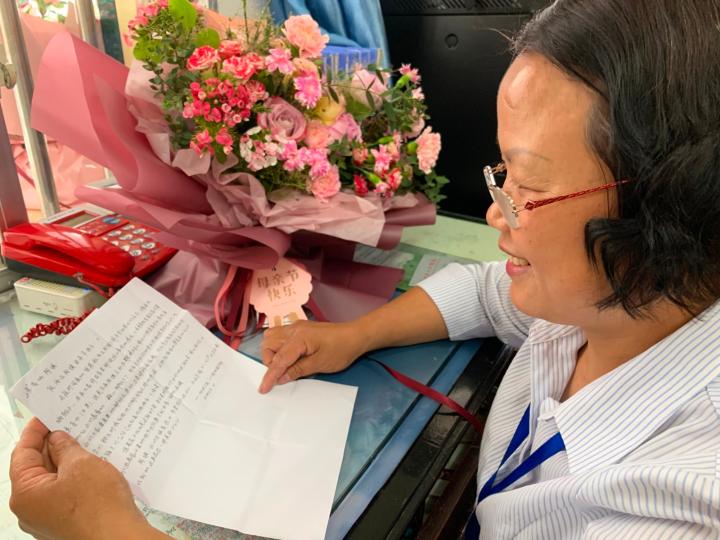 “阿姨,今天是您上班吗?一会有人来送东西,您帮我收一下呗。”5月9日一大早,Beat365中国唯一官方网站学生宿舍——李园5舍的值班员杨跃洪就收到517寝室物理科学与技术学院2017级学生董思佳的消息。即将开校复学,这两天宿管阿姨收到学生们请求帮忙收快递的短信很平常。“我以为是快递,要开学了嘛,这几天宿舍群里孩子们可激动了!”出乎意料的是,杨阿姨等来的是一束送给她的鲜花和一封亲笔信。