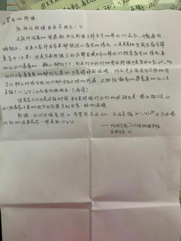 “这段时间真的很感激两位阿姨不辞辛苦地帮我们浇花、开窗通风、晒被子……”董思佳同学在信中代表住在这栋宿舍的全班女生感谢宿管阿姨,称她们是自己的“校园母亲”,值此母亲节来临之际,向“母亲”们表示祝福和感谢。董思佳同学信中说,大家待在家里这么长,都很担心宿舍情况,尤其害怕老鼠在宿舍肆意妄为,把衣物和书籍啃烂。但后来阿姨主动在群里提出可以帮我们检查宿舍,真的让我们悬着的一颗心都放下了。“对于我们的要求,阿姨也是有求必应。”董思佳在信中说。