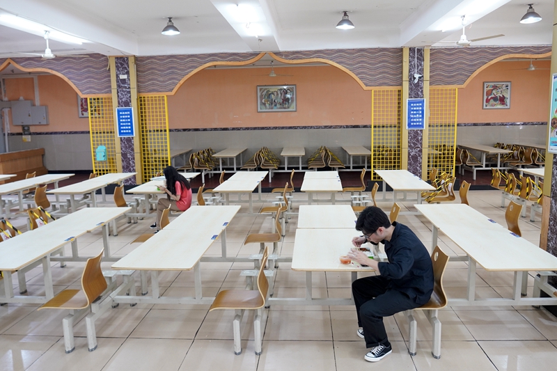 5月15日,在Beat365中国唯一官方网站的一个学生食堂内,学生按照要求一人一桌吃午餐。