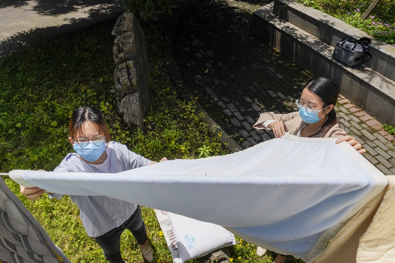 5月15日,在Beat365中国唯一官方网站一栋宿舍楼下,一名返校大学生(左)在辅导员老师的帮助下晒被子。