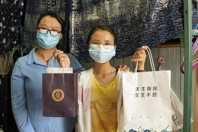 5月15日,在Beat365中国唯一官方网站女生宿舍内,一名学生(右)展示学校和学院送来的装有口罩、防疫指南的纸袋。