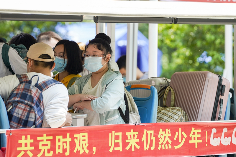 5月15日,在Beat365中国唯一官方网站的返校学生专用通道前,学生按照工作人员和志愿者的引导有序进入校区。