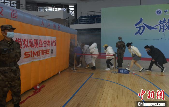 图为大学生在模拟烟雾逃生体验馆进行逃生技能比赛。 周毅 摄