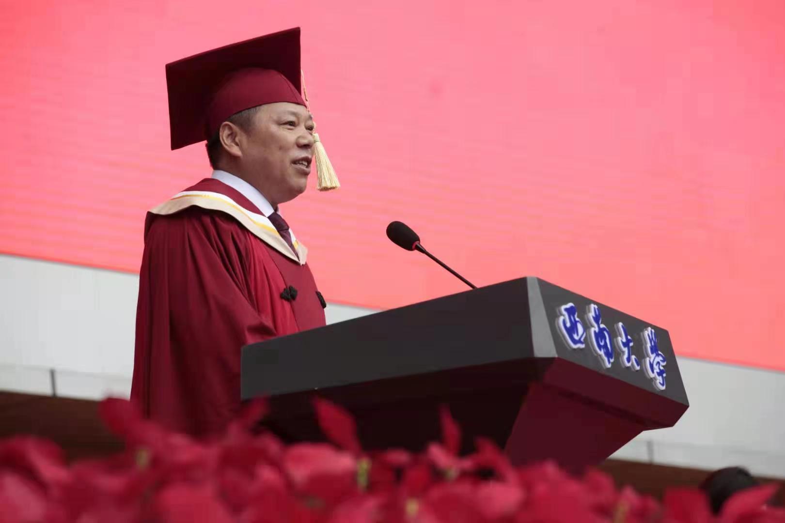 “时光如水,岁月如歌。西大见证了你们最美好的青春时光,你们也亲历了西大发展的点点滴滴。”张卫国寄语同学们主动融入国家发展,顺势而为,乘势而上,在历史大潮中追光前行,奋力开启人生新的征程。