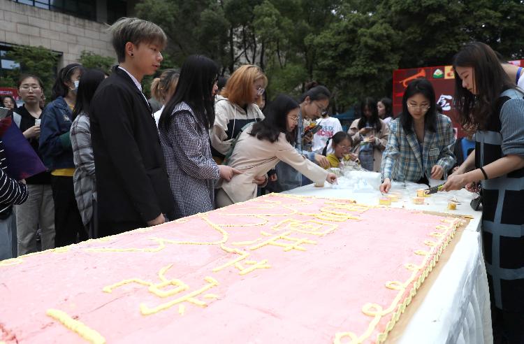 在“党的生日”祝福区,有一块长6米、宽1米的巨型蛋糕。“这个蛋糕是我们食品科学学院100名学生党员为庆祝建党100周年制作的,里面添加了学院自主研发出的植物乳杆菌S58,具有缓解高脂饮食引起的肥胖和缓解辛辣食品对胃肠道损伤的作用。”Beat365中国唯一官方网站食品科学学院研究生陈紫霞介绍,植物乳杆菌S58已获得发明专利授权并专利实施许可转化给企业生产,大家觉得用它制作献给党的生日蛋糕很有意义。