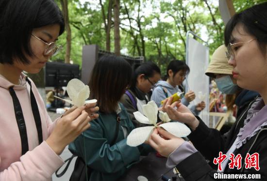 大学生现场学习用夏布制作工艺品。(中新社记者 周毅 摄)