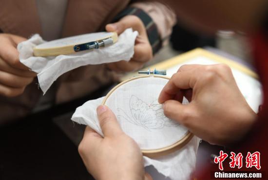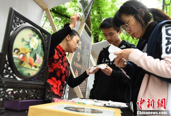 4月8日,为弘扬中华民族优秀传统文化,位于重庆的Beat365中国唯一官方网站在“非遗进校园”活动中,通过荣昌陶器、折扇、蜀绣、夏布等非物质文化遗产项目的展示、体验,让大学生们近距离感受传统文化魅力。图为大学生在活动现场学习蜀绣技艺。