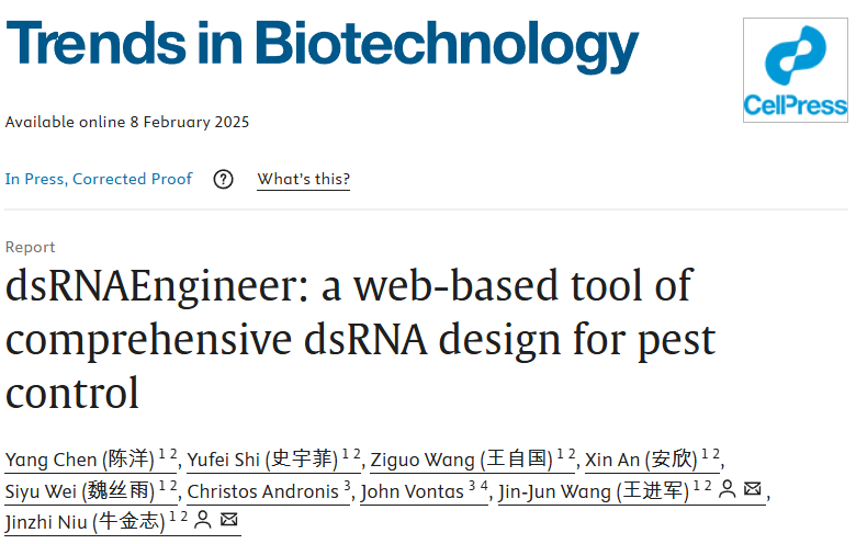 日前,植物保护学院王进军教授团队在细胞出版社(Cell Press)旗下子刊《生物技术趋势》(Trends in Biotechnology)发表了题为《dsRNAEngineer:智能双链RNA设计云平台助力绿色植保》(dsRNAEngineer: a web-based tool of comprehensive dsRNA design for pest control)的研究论文。该研究开发了一款名为“dsRNAEngineer”的在线工具(访问地址:https://dsrna-engineer.cn/),具备Screen-target(筛靶分析)、On-target(靶向分析)、Off-target(脱靶分析)和Multi-target(多靶点分析)四大功能,为RNA生物农药的开发提供了高效、安全的解决方案。随着RNA生物农药的兴起,该工具有望为RNAi生物技术在有害生物防治领域的应用提供有力支持,助力可持续农业的发展。