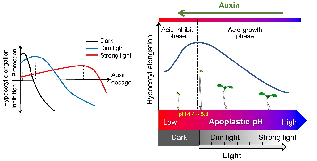 该研究发现,生长素以剂量依赖的方式诱导SAUR家族基因表达。随着生长素剂量的增加,SAUR家族蛋白水平逐渐积累,促使质膜质子泵H+-ATPase活性被逐渐激活,质子持续外流,进而促使下胚轴表皮细胞质外体被逐渐酸化。根据酸生长理论,质外体适度酸化促进细胞延展,而该研究发现当质外体酸化到一定程度则抑制细胞延展。因此,生长素的双重效应取决于细胞对质外体酸化程度(pH)的响应,且发生在生长素介导的转录重编程之后。光信号促使下胚轴表皮细胞质外体pH升高,抵消生长素诱导的质外体的过度酸化,使得生长素在光下促进下胚轴伸长。