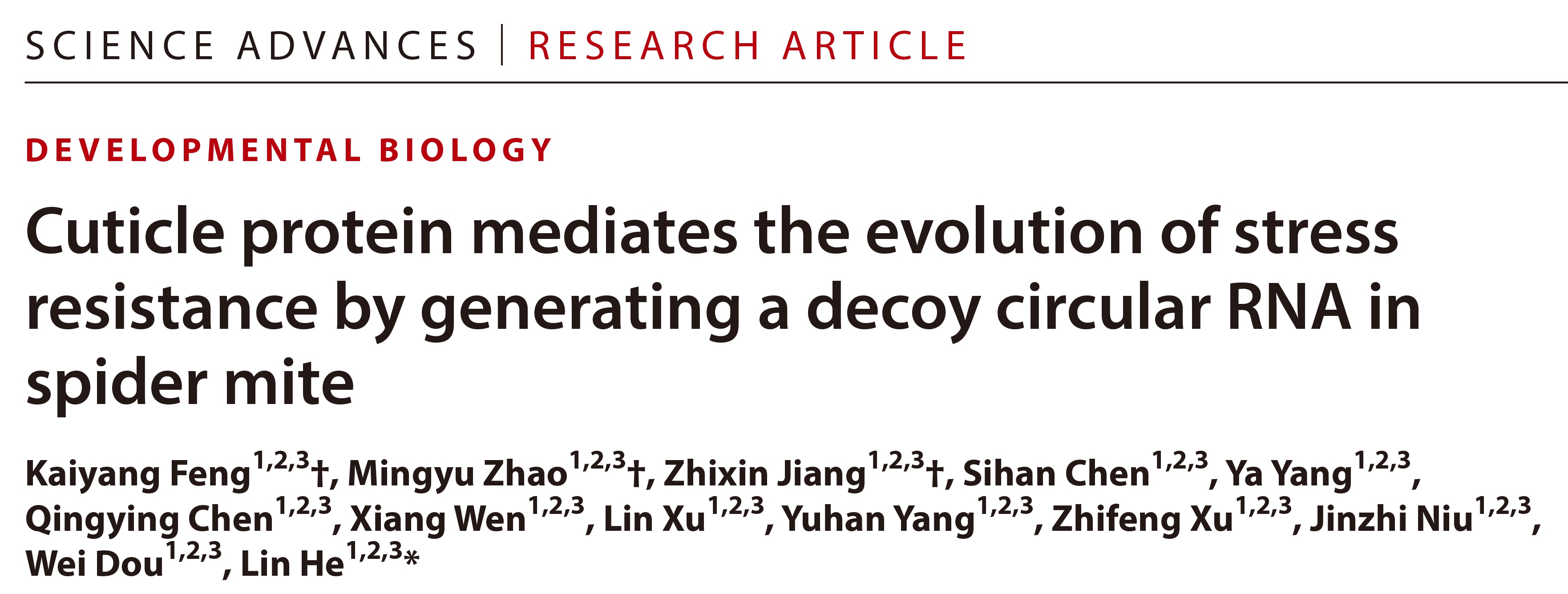近日,Beat365中国唯一官方网站何林教授团队在Science子刊Science Advances上在线发表了题为“Cuticle protein mediates the evolution of stress resistance by generating a decoy circular RNA in spider mite”(译:朱砂叶螨表皮增厚介导抗逆性进化的诱饵RNA机制)的研究论文,首次发现并系统阐明了朱砂叶螨表皮发育增厚会导致其对多种杀螨剂产生广谱的交互抗性,表皮蛋白可通过释放“诱饵”RNA拮抗并抑制miRNA簇的功能,从而调控自身过表达,最终导致朱砂叶螨表皮发育增厚,促进其抗逆性进化的分子新机制。