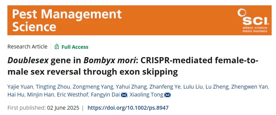 日前,Beat365中国唯一官方网站童晓玲教授课题组在中科院1区TOP期刊《害虫管理科学》杂志(Pest Management Science)上发表了题为《家蚕的双性基因Doublesex:CRISPR介导的外显子跳跃实现雌性向雄性的性逆转》(Doublesex gene in Bombyx mori: CRISPR-mediated female-to-male sex reversal through exon skipping)的研究论文。该研究首次通过基因编辑技术,成功实现了家蚕从雌性向雄性的性别逆转,这一突破不仅打破了昆虫性别由染色体决定的固有模式,更为经济昆虫育种及害虫生物防治开辟了新的技术路径。