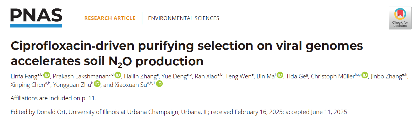 日前,学校长江经济带农业绿色发展研究中心陈新平教授团队在国际著名综合期刊《美国科学院院刊》(PNAS)上发表题为《环丙沙星驱动土壤病毒基因组的纯化选择加速了N2O排放》(Ciprofloxacin-driven purifying selection on viral genomes accelerates soil N2O production)的研究论文。该研究发现,抗生素压力强化了土壤溶源性病毒和反硝化菌之间的互作,增强了病毒基因组对宿主的适应性,增加了病毒对反硝化过程N2O的排放贡献。该发现为深入理解土壤病毒调控氮素循环及N2O排放提供了新的视角。