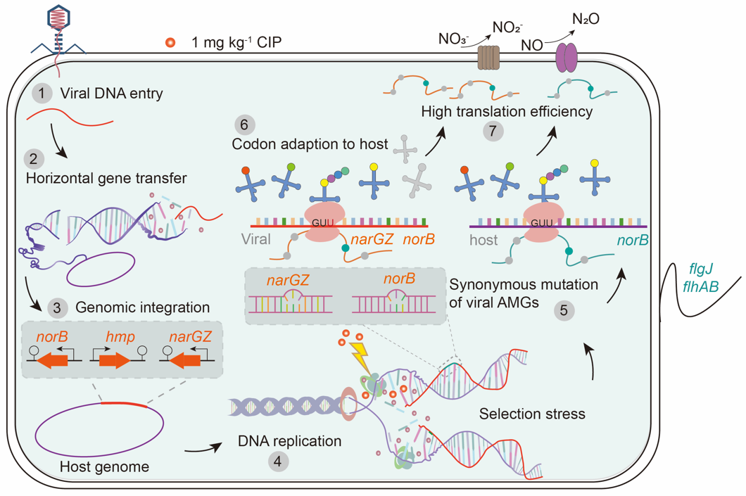 研究团队以环丙沙星为典型抗生素,揭示了抗生素压力差异性改变土壤氮素初级转化速率,增加了反硝化过程N2O排放。进一步通过病毒提取-回接实验发现,土壤病毒对N2O排放贡献为18-29%。该发现强调了土壤病毒对元素地球化学循环的重要性。抗生素压力下,土壤病毒倾向于溶源性循环的生活方式,通过基因组整合和水平基因转移增加了病毒辅助代谢基因,增强了与反硝化宿主的互作。抗生素压力促进了病毒辅助代谢基因同义突变,基因组的纯化选择增强了其对宿主的适应性。特别是与反硝化相关的辅助代谢基因,增加了反硝化过程N2O排放。