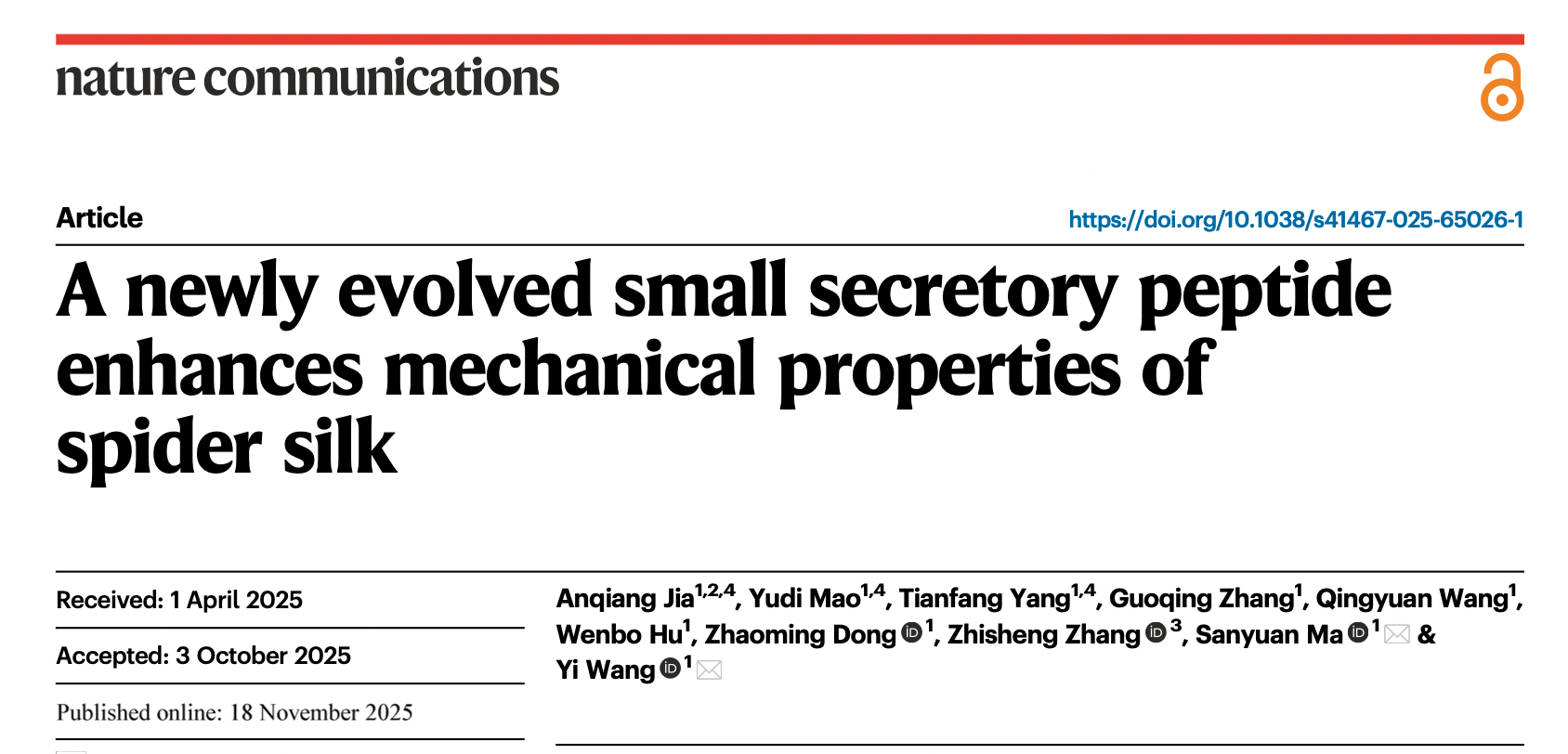 近日,前沿交叉学科研究院生物学研究中心王翊/马三垣教授团队在《自然通讯》(Nature Communications)期刊在线发表题为《一种新进化的增强蜘蛛丝机械性能的小分泌肽》(A newly evolved small secretory peptide enhances mechanical properties of spider silk)的研究论文,通过系统演化基因组学方法,在棒络新妇蜘蛛(Trichonephila clavata)基因组中发现了大量在圆蛛总科(Araneoidea)祖先分化后新出现的基因,并揭示其中一个名为SpiCE-DS8的小分子分泌肽,能够显著提升丝的力学性能。该研究不仅为理解蜘蛛丝腺的功能演化提供了全新视角,也为人工合成高性能仿生纤维材料开辟了新路径。