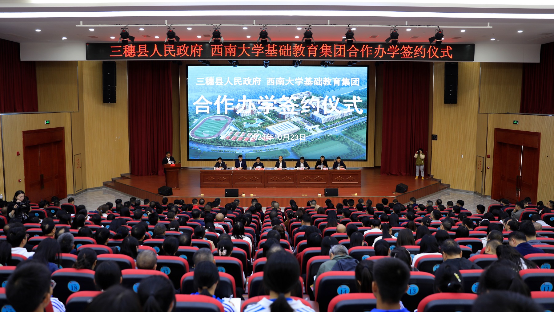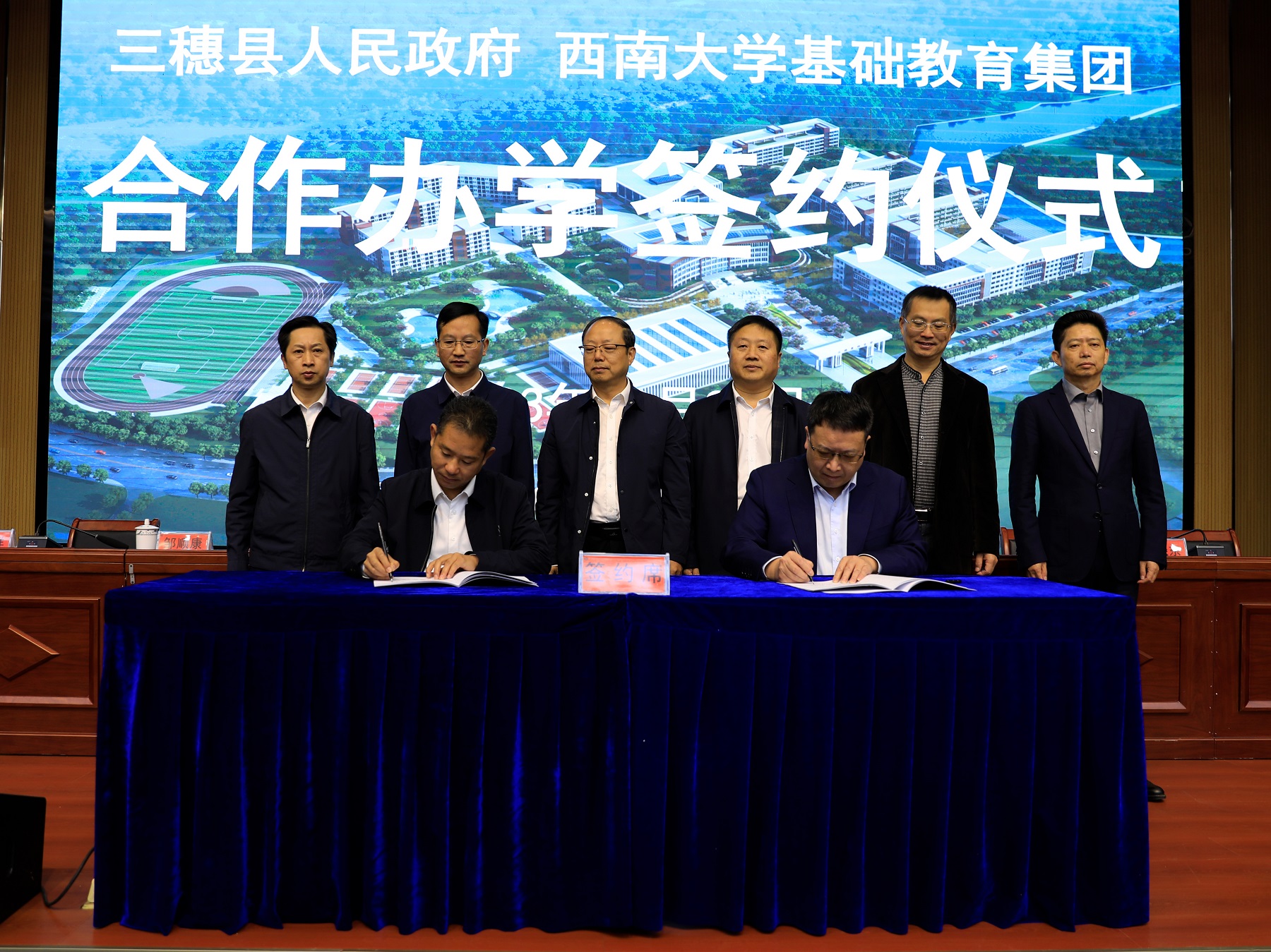 为认真贯彻落实国家《“十四五”县域普通高中发展提升行动计划》,推动民族地区基础教育优质均衡发展,10月23日,基础教育投资管理有限公司与贵州省三穗县人民政府合作共建“三穗民族高级中学”签约仪式在贵州三穗县民族高级中学举行,学校副校长周光明,三穗县县委书记刘明波、县长杨波出席仪式。