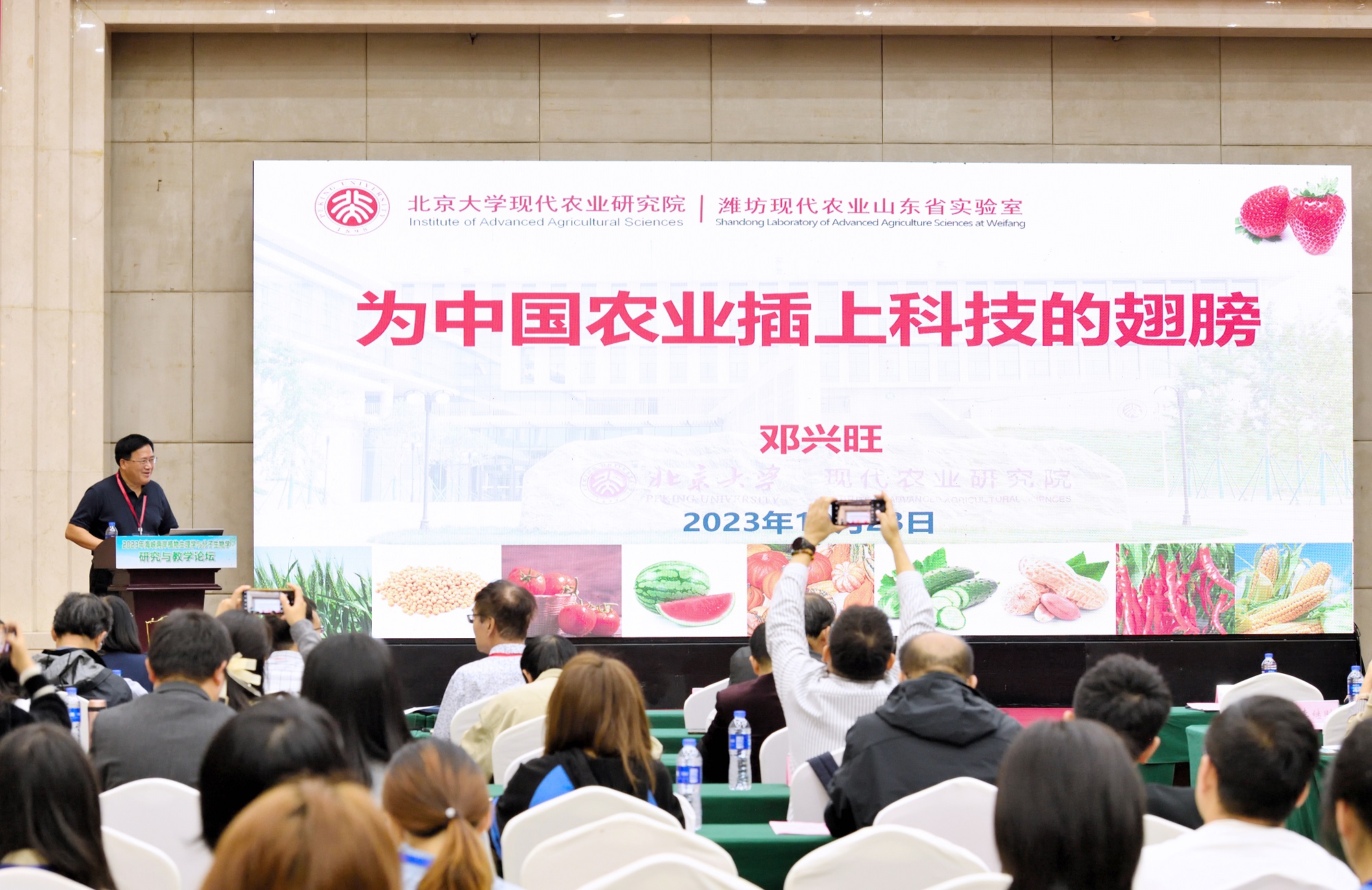 学校党委书记李旭锋出席论坛,并主持由中国科学院院士、中国植物生理与植物分子生物学学会理事长陈晓亚所作的特邀报告。论坛于10月23日上午开幕,重庆市科协党组成员、副主席戈帆,学校党委副书记黄杰,中国植物生理与植物分子生物学会副理事长赵德刚,台南大学教授程台生分别致辞。开幕式结束后,美国国家科学院院士、北京大学现代农业研究院院长邓兴旺作题为“给中国农业插上科技翅膀”的特邀报告。