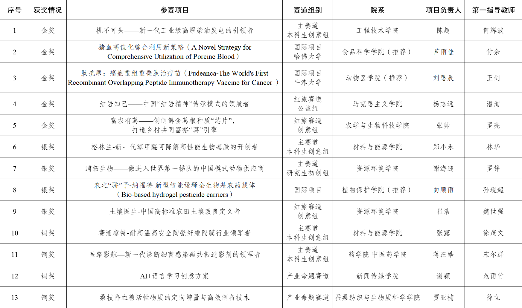 学校共13个项目入围全国总决赛,经过网评、会评,9个项目进入全国总决赛现场比赛,网评通过率近70%,远高于全国30%的平均水平。各项目团队在分组、抽签不利的情势下,在各大项目中高水平发挥,展现出学校学子风采,展示了学校育人成果,有效提升了学校影响力。在学校摘得金奖的项目中,红旅公益组“红岩知己”项目是9年来首个红色精神项目;本科生创意组“机不可失”项目再续辉煌,在激烈竞争中脱颖而出;红旅创意组“富农有葛”项目和国际项目“Fudeanca”均在抽签排序第一的情况下披荆斩棘、斩获金奖;国际项目“Porcine Blood”负责人是现就读于哈佛大学的西大优秀毕业生,不负众望、表现出色。