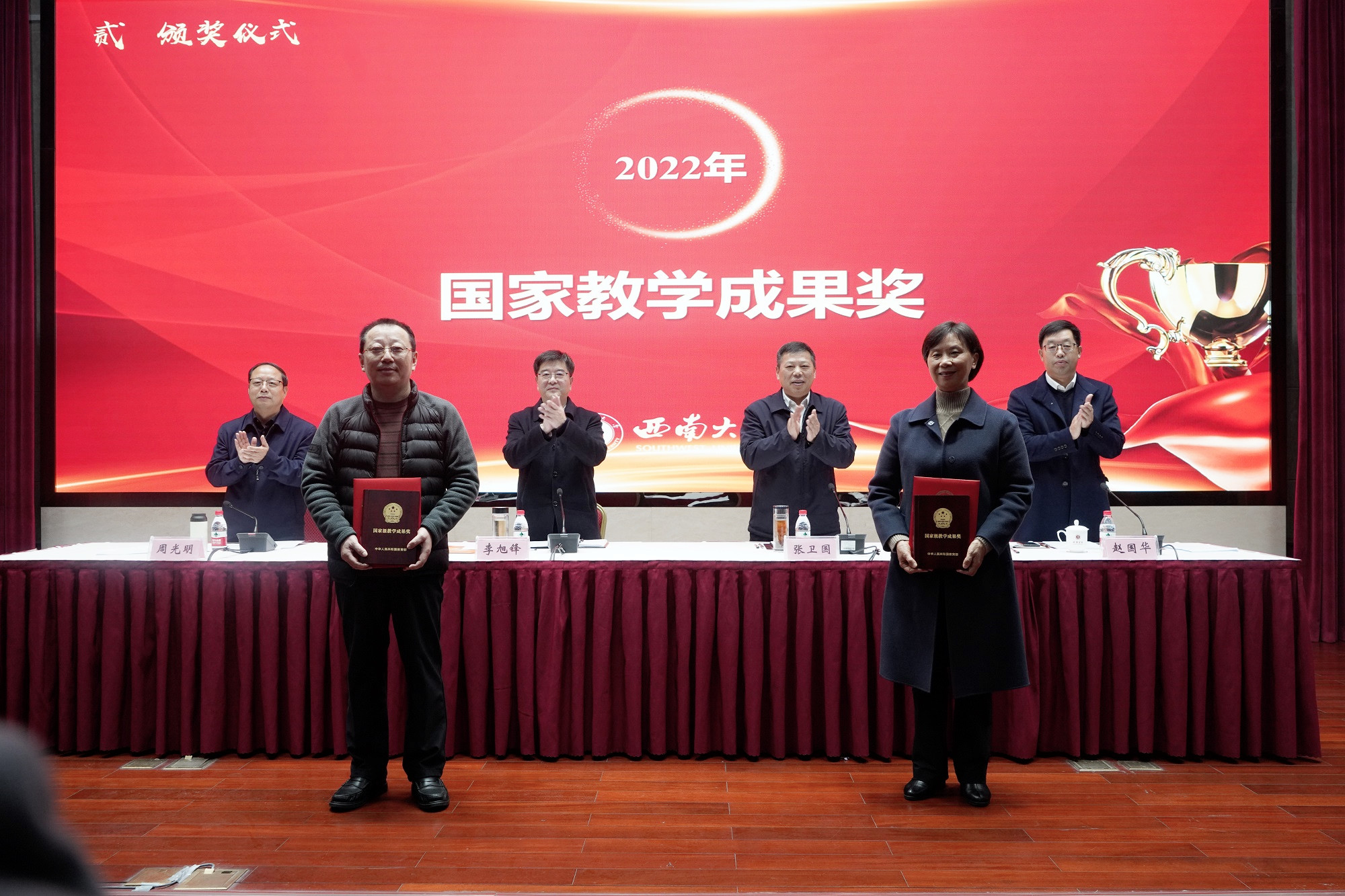赵国华宣读《Beat365中国唯一官方网站关于表彰省级以上教学成果奖的决定》,参会校领导为获得2022年国家教学成果奖、2021年重庆市教学成果奖特等奖及一等奖的团队代表颁奖。