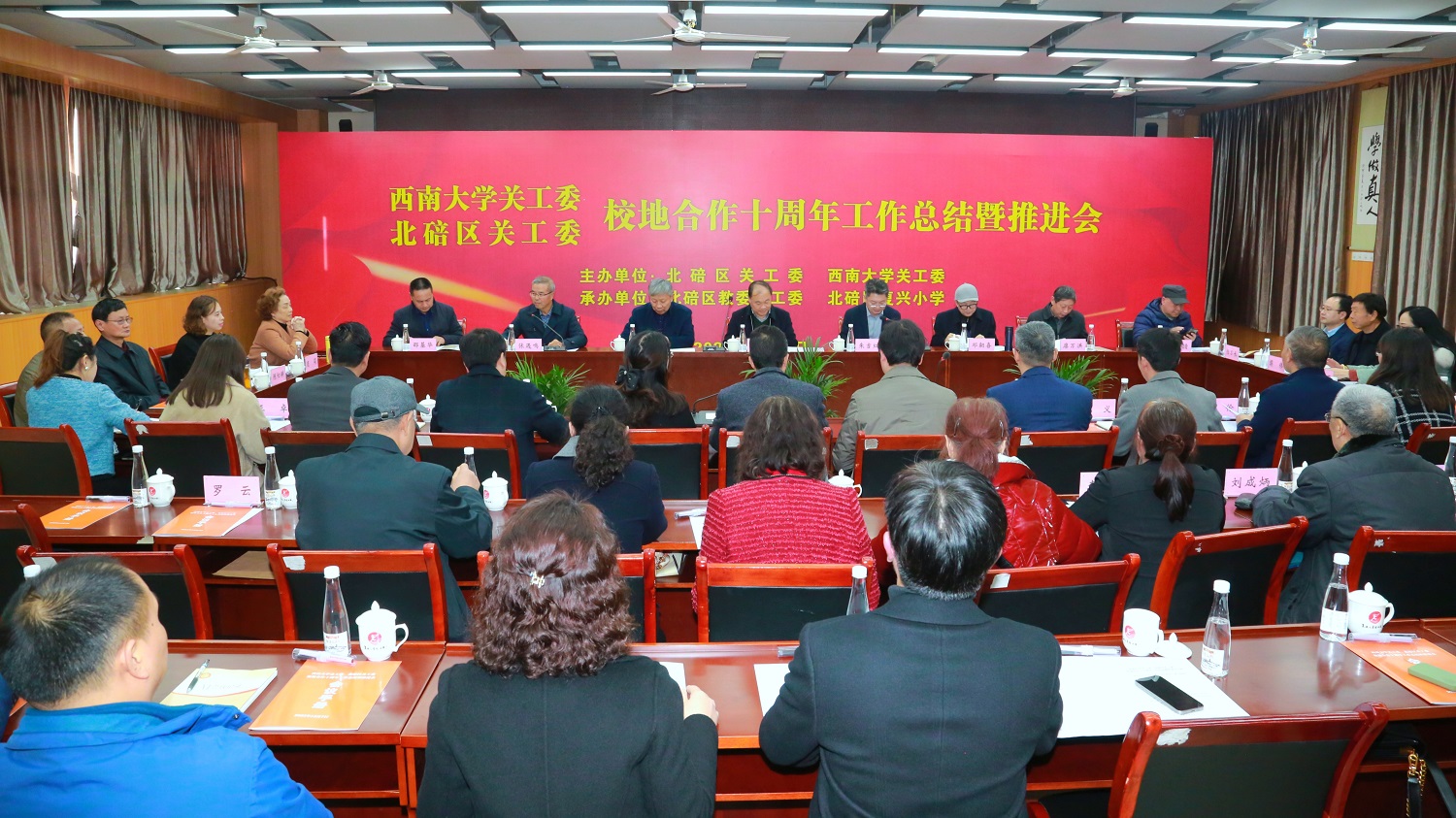 近日,学校关工委、北碚区关工委“校地合作十周年工作总结暨推进会”在复兴小学召开。北碚区人大常委会副主任朱吉红主持会议。重庆市关工委副主任韩国涛,市教委关工委常务副主任邓朝喜,学校关工委常务副主任宋乃庆,北碚区关工委常务副主任张遇鸣出席会议。学校和北碚区有关部门负责人,北碚区有关镇街关工委、中小学校负责人等40余人参加会议。