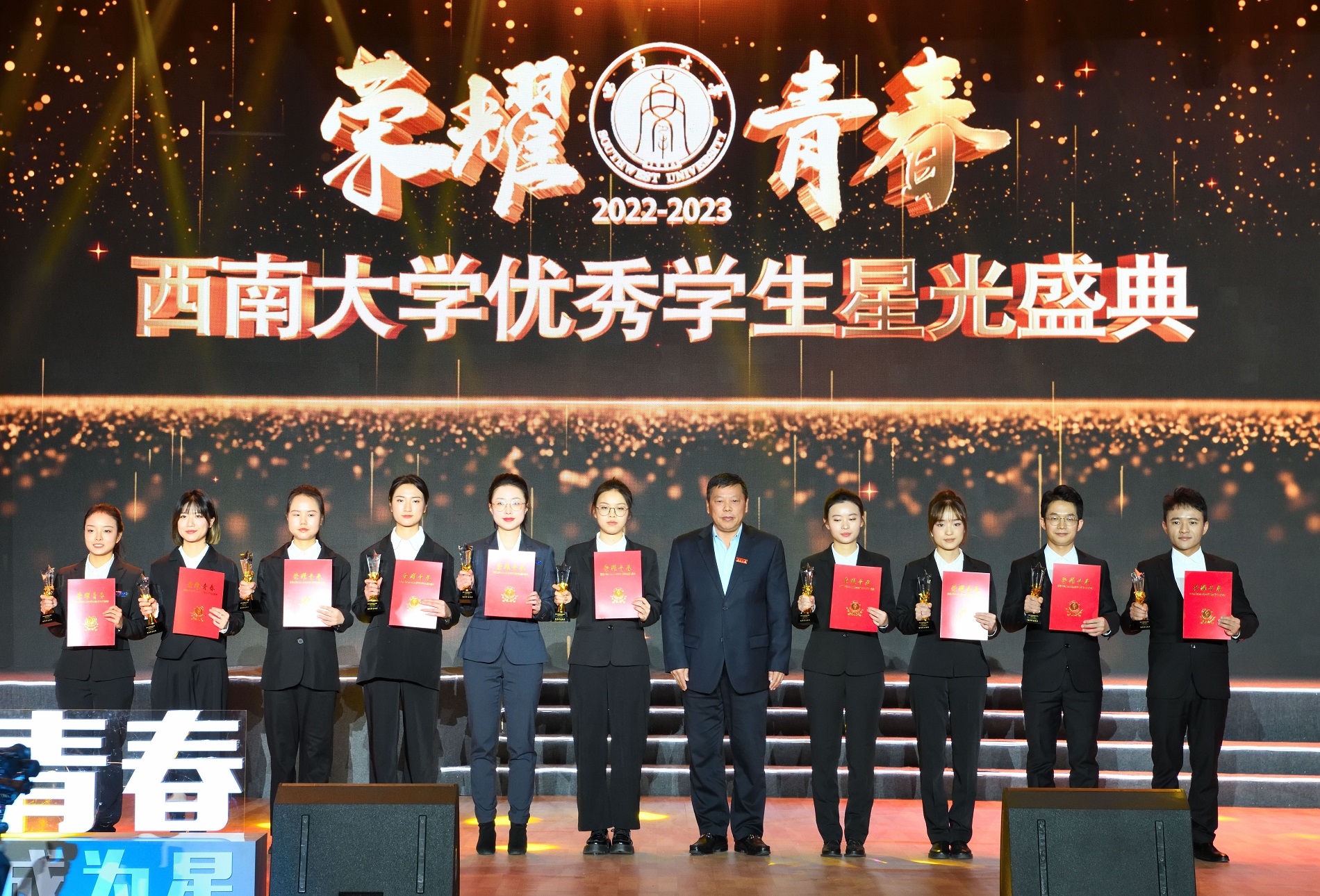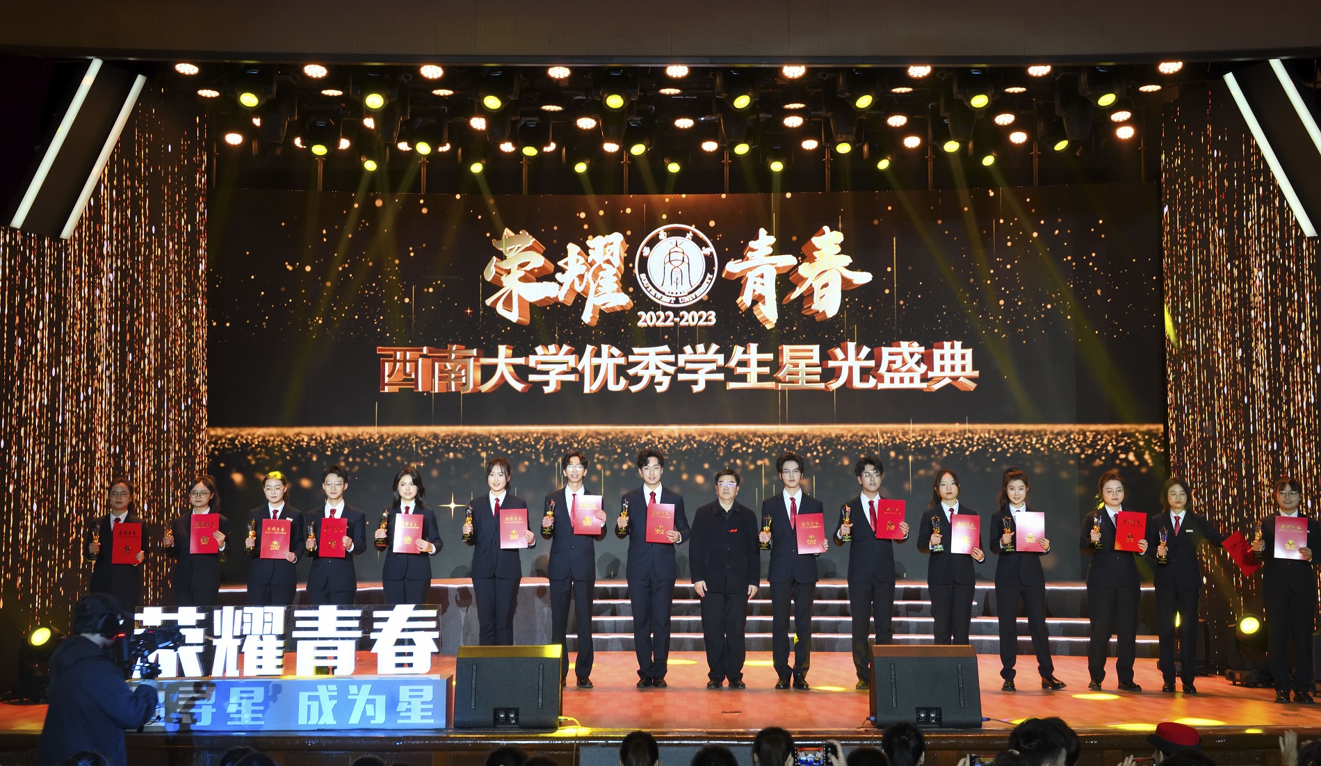 青春因奋斗而出彩,青春因荣耀而闪亮。为激发全校学生学习先进、争当先进、赶超先进的热情,营造优良校风学风,全面彰显“新学工”育人格局,用典礼定格西大好青年的青春群像,12月17日晚,学校“荣耀青春”2022-2023学年优秀学生星光盛典在光大礼堂举行。学校全体在校校领导出席活动并为受表彰学生颁奖。学校学生工作领导小组成员单位负责人,教学单位党政负责人,辅导员、班主任代表,校友代表,学生代表等800余人参加活动。