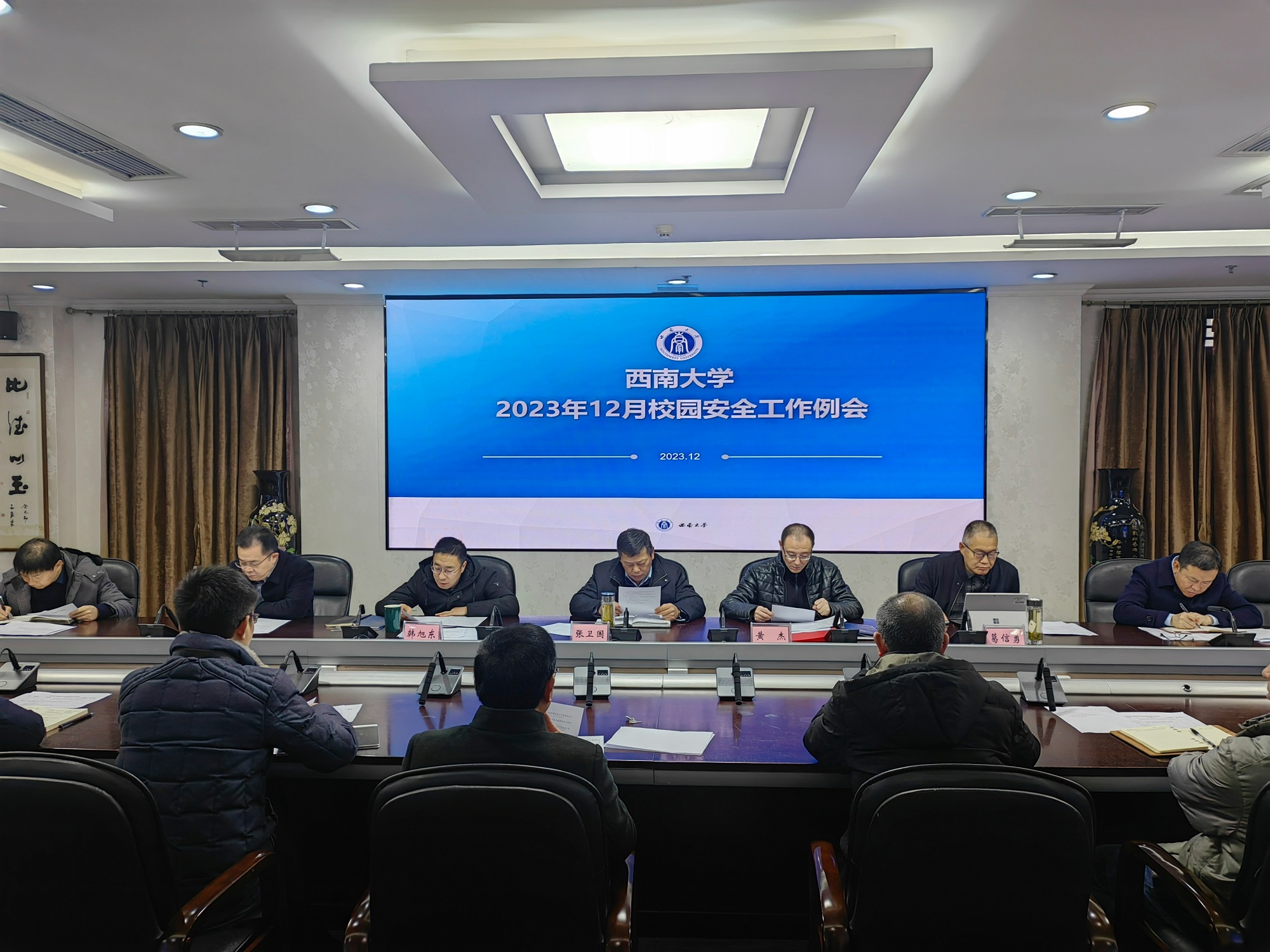 12月26日上午,学校12月校园安全工作例会在行署楼A栋第五会议室召开。校长张卫国,党委副书记黄杰,副校长韩旭东、葛信勇出席会议,相关职能部门负责人参会。会议由张卫国主持。