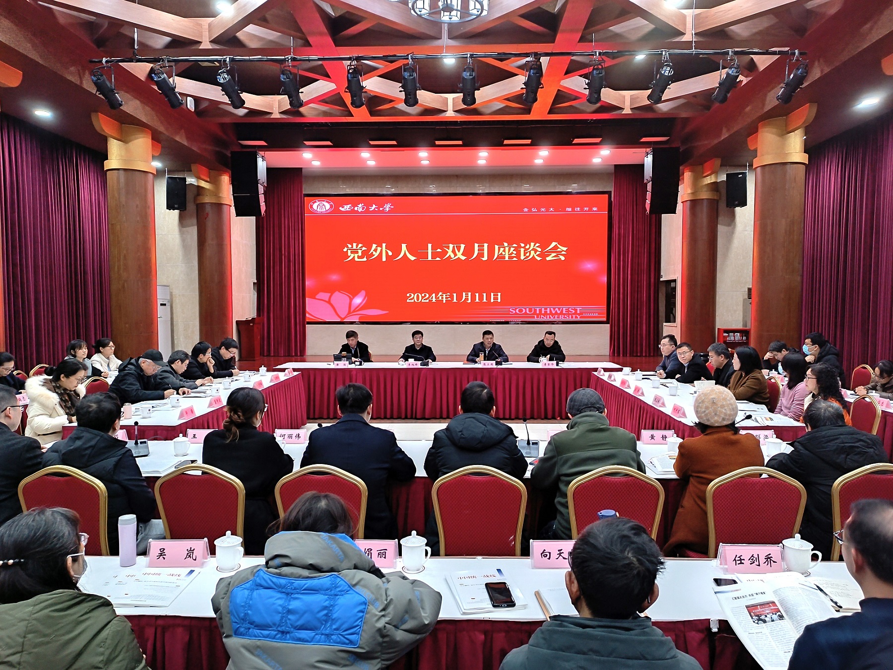 学校民主党派中央委员,重庆市委会主副委、常委,民主党派区委会主副委,民主党派学校基层委员会主副委、委员以及统战团体负责人,党政办公室、党委组织部、党委宣传部、党委统战部、党委教师工作部主要负责人等参加会议。