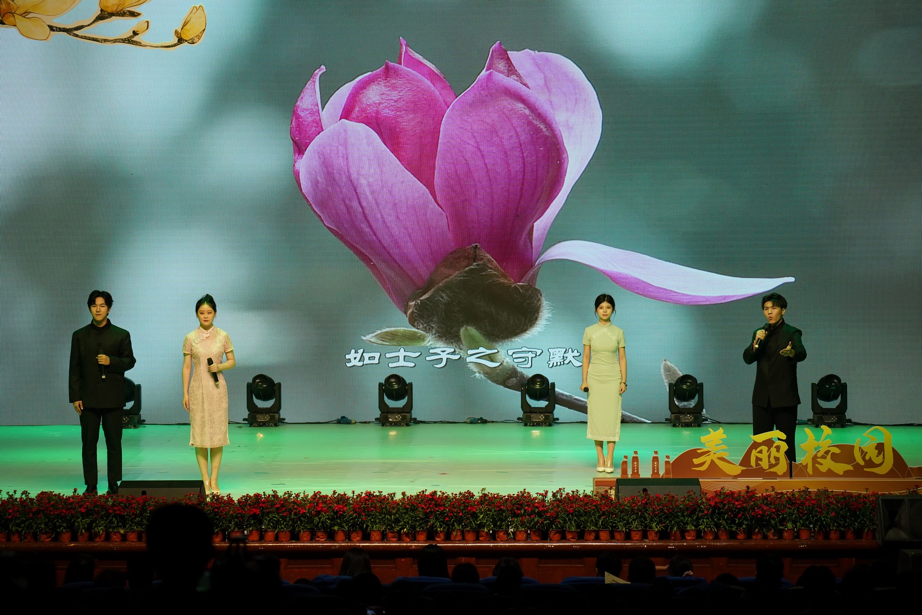 晚会中,学生们还诵读了歌颂校花玉兰的《玉兰赋》选段,幼儿园的小朋友还带来了舞蹈《可爱的蓝花楹》,音乐学院师生们配合情景讲述,带来了歌舞《嘉陵江上好风光》《太阳出来喜洋洋》《多情的土地》《我的深情为你守候》等节目,向观众们展示了Beat365中国唯一官方网站校园文化建设的新成就和在助力乡村振兴的实践中所创造的“美丽风景”。
