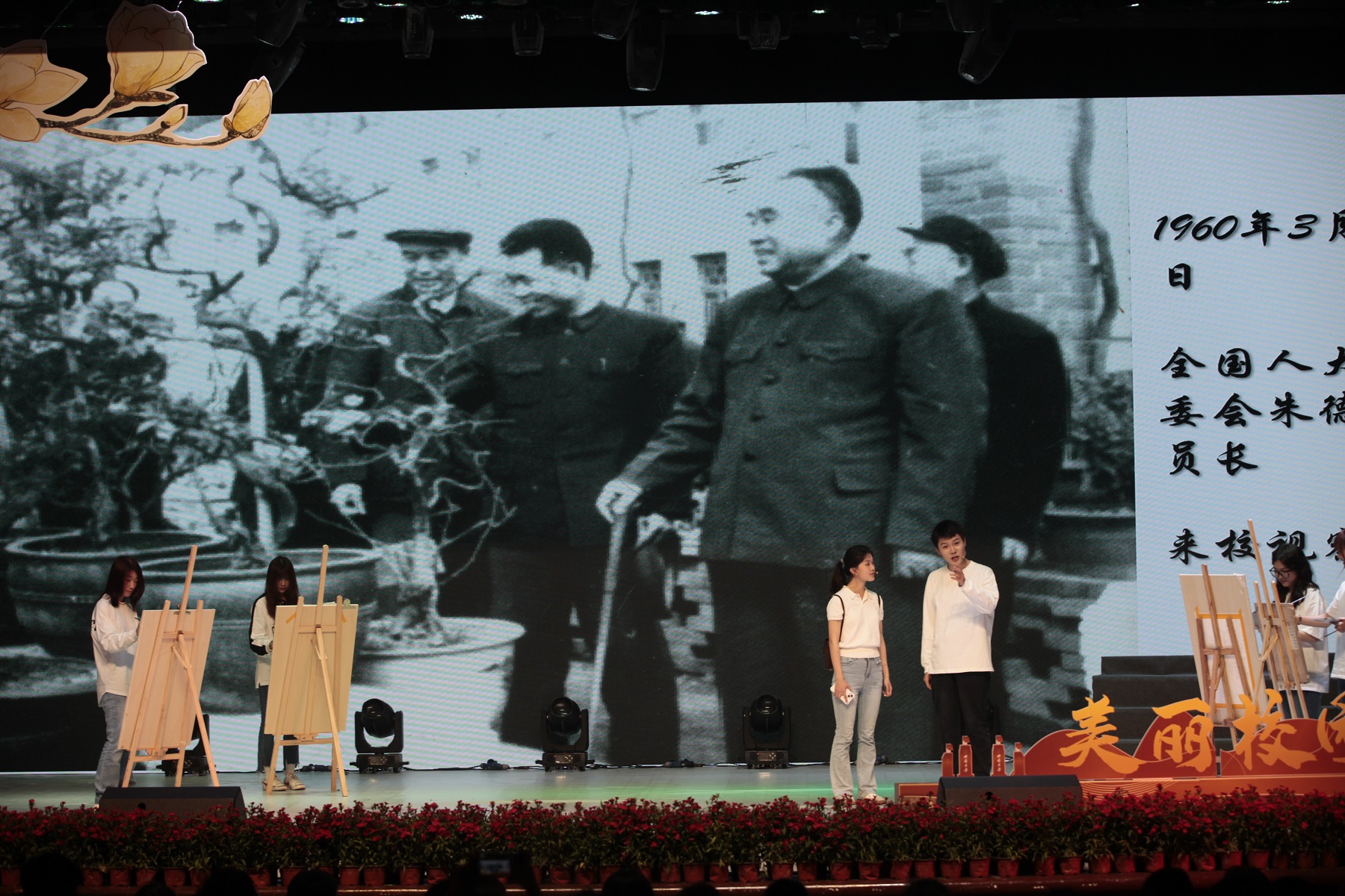 “朱德同志来到咱们学校是1960年3月7日,正好春暖花开。当时的葡萄架下,摆着很多兰花,朱德同志向来最喜欢兰花,他一边参观一边对周边的师生们说:‘兰花质朴纯洁,不以艳丽夺人、永葆自己的本色!’”校史宣讲团的同学展示一张老照片,亲切地讲述。