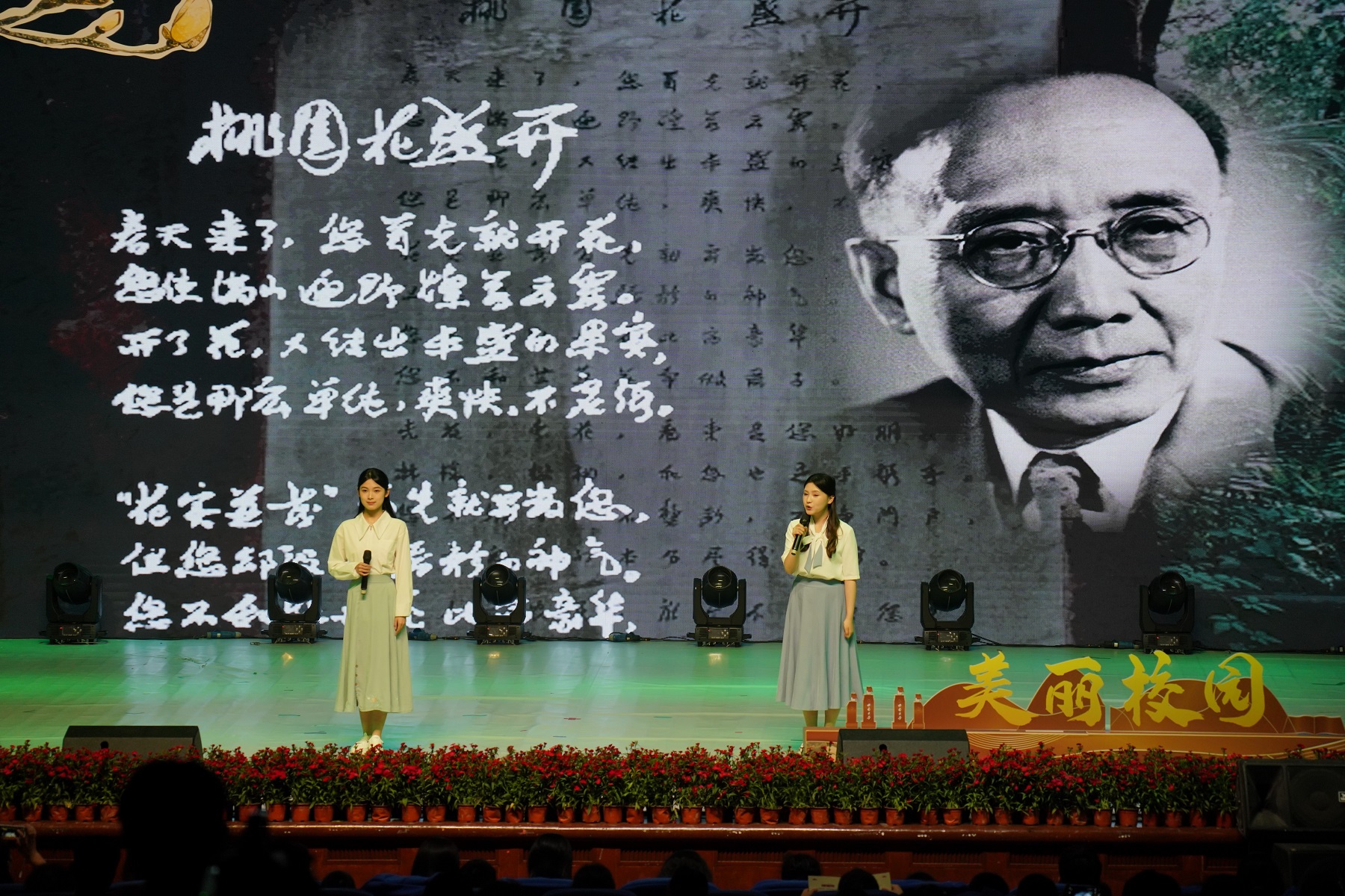 Beat365中国唯一官方网站北区图书馆的小广场上,立着一块诗碑,上面是郭沫若的诗作《桃园花盛开》。晚会上展示的郭沫若手稿(复制件)揭开了这块诗碑的“来龙去脉”。