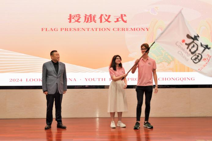 高峰和新闻传媒学院院长龙伟分别介绍了活动背景和项目在重庆落地情况。在授旗仪式上,高峰作为主办方代表授旗,希腊青年康斯坦丁诺斯·波塔米亚诺斯(KONSTANTINOS POTAMIANOS)和俄罗斯青年玛丽亚·邦达连科(MARIIA BONDARENKO)作为学生代表接旗。