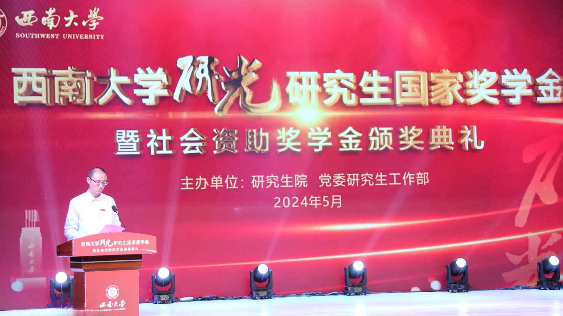 5月10日,学校在光大礼堂举行“研·光”研究生国家奖学金暨社会资助奖学金颁奖典礼。典礼以“追光逐梦,勇毅前行”为主题。校长王进军、党委副书记黄杰出席典礼。