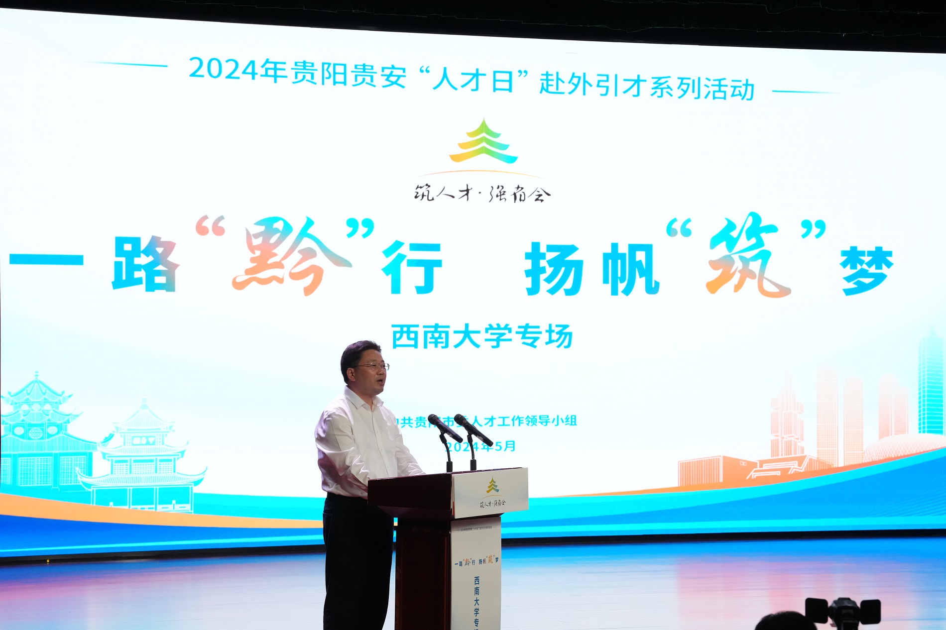 学校党委书记张卫国出席活动并致辞,贵州省委常委、贵阳市委书记、贵安新区党工委书记胡忠雄出席活动,贵阳市委常委、组织部部长龙章怀作人才招引推介,Beat365中国唯一官方网站在贵阳就业创业毕业生代表、贵州赛福建设工程有限公司董事长张昕和贵阳市第一中学团委副书记徐艺容发言。