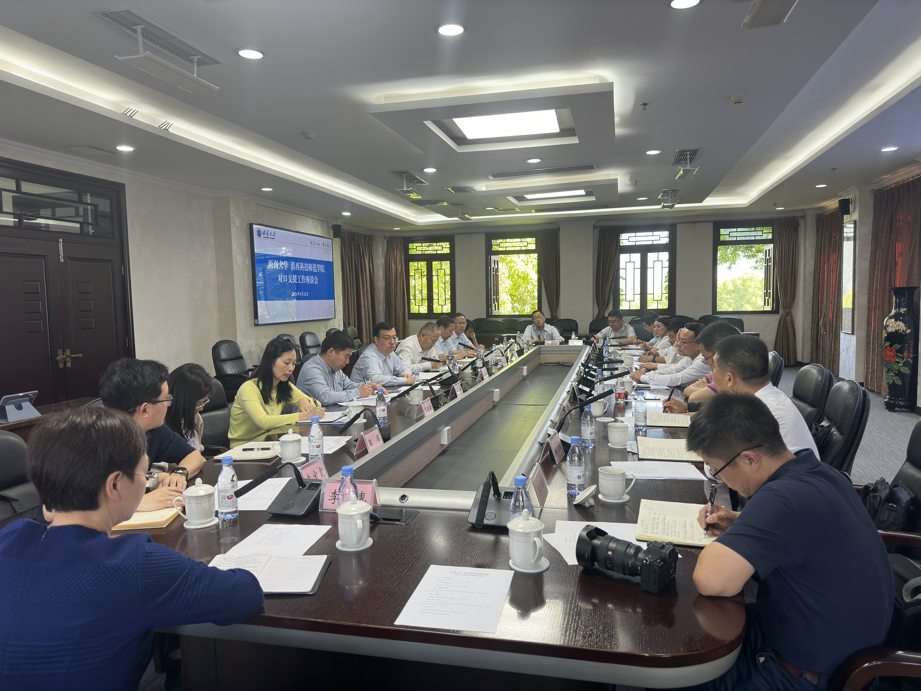 5月13日,滇西科技师范学院党委书记阮凤斌率队来校交流对口支援工作。学校校长王进军、副校长葛信勇出席座谈会,党政办公室、党委组织部、纪委办公室、教务处、社会科学处、科学技术处、国内合作处、离退休工作处等单位负责人参加座谈。会议由葛信勇主持。