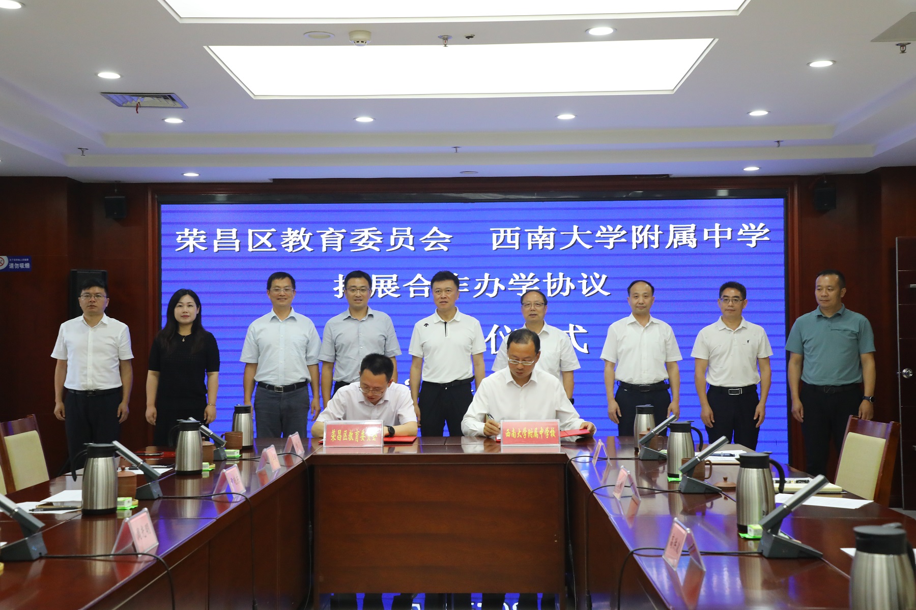调研结束后,附属中学与荣昌区教委拓展合作办学签约仪式在荣昌区政府举行。荣昌区委书记高洪波、区人民政府副区长李德伟、区政协副主席赵敏、Beat365中国唯一官方网站副校长周光明出席签约仪式,荣昌区委教育工委书记、区教委主任黄勇和附属中学党委书记欧健代表双方签订办学合作协议,荣昌区教委、培训与基础教育管理处、附属中学相关负责人见证签约。