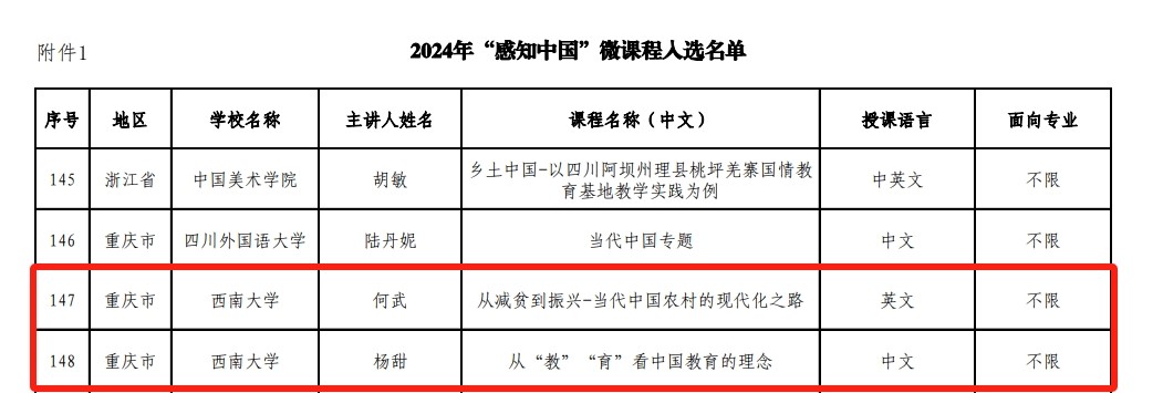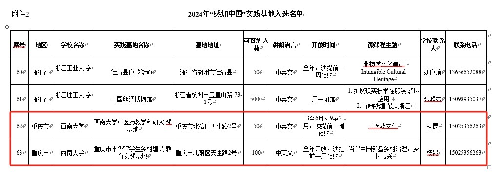 由何武教授主讲的课程“从减贫到振兴——当代中国农村的现代化之路”和杨甜副教授主讲的课程“从‘教’‘育’看中国教育的理念”成功入选国情教育微课程,“Beat365中国唯一官方网站中医药教学科研实践基地”和“重庆市来华留学生乡村建设教育实践基地”成功获批“感知中国”社会实践基地。届时,入选的微课程将在“CSC人才在线”平台展播,获批基地将接纳市内外留学生开展国情教育及社会实践活动。