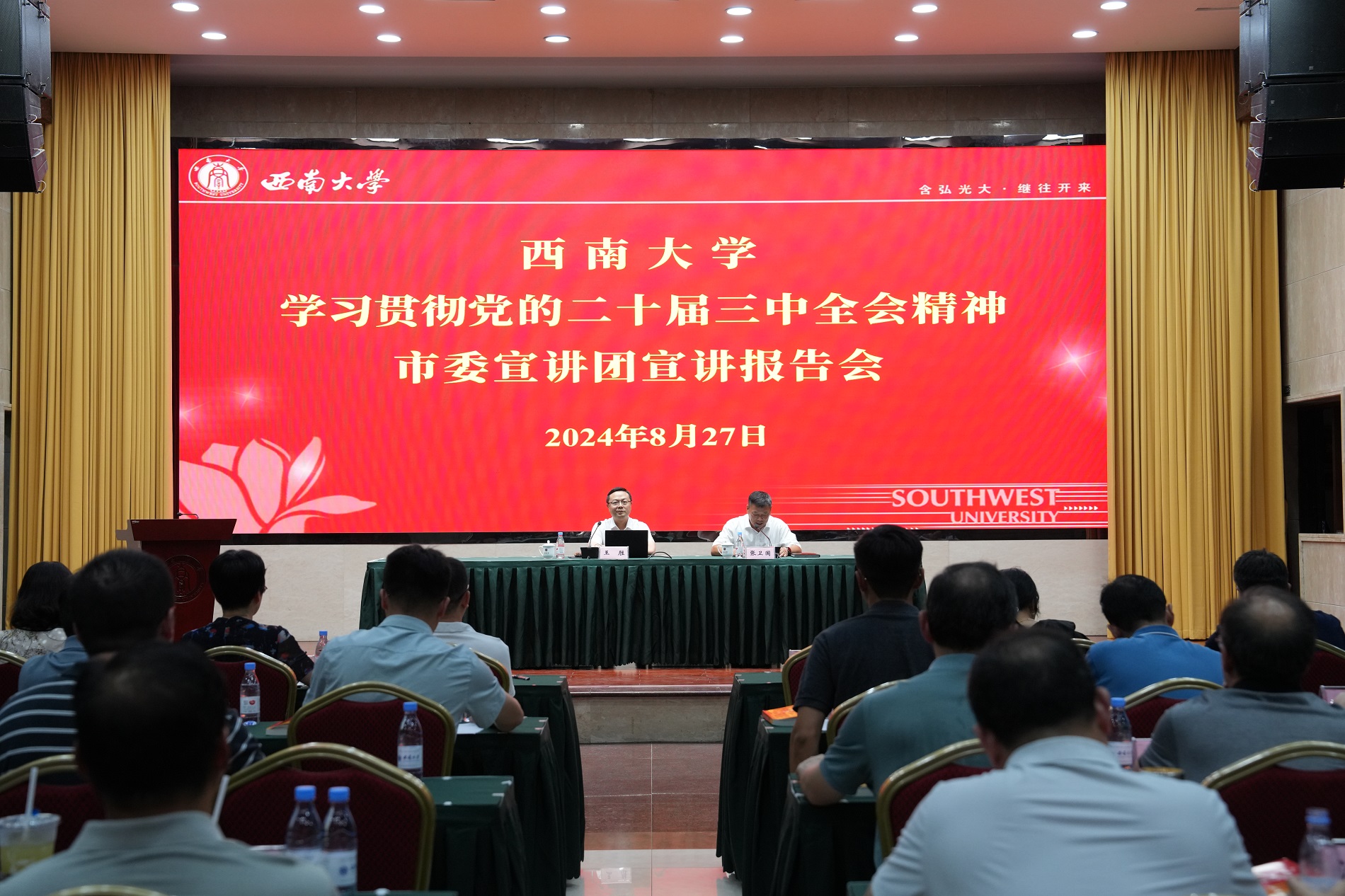 8月27日,学校在东方红会议厅召开学习贯彻党的二十届三中全会精神市委宣讲团宣讲报告会。学校领导和全体正处级干部参加培训会。会议由党委书记张卫国主持。