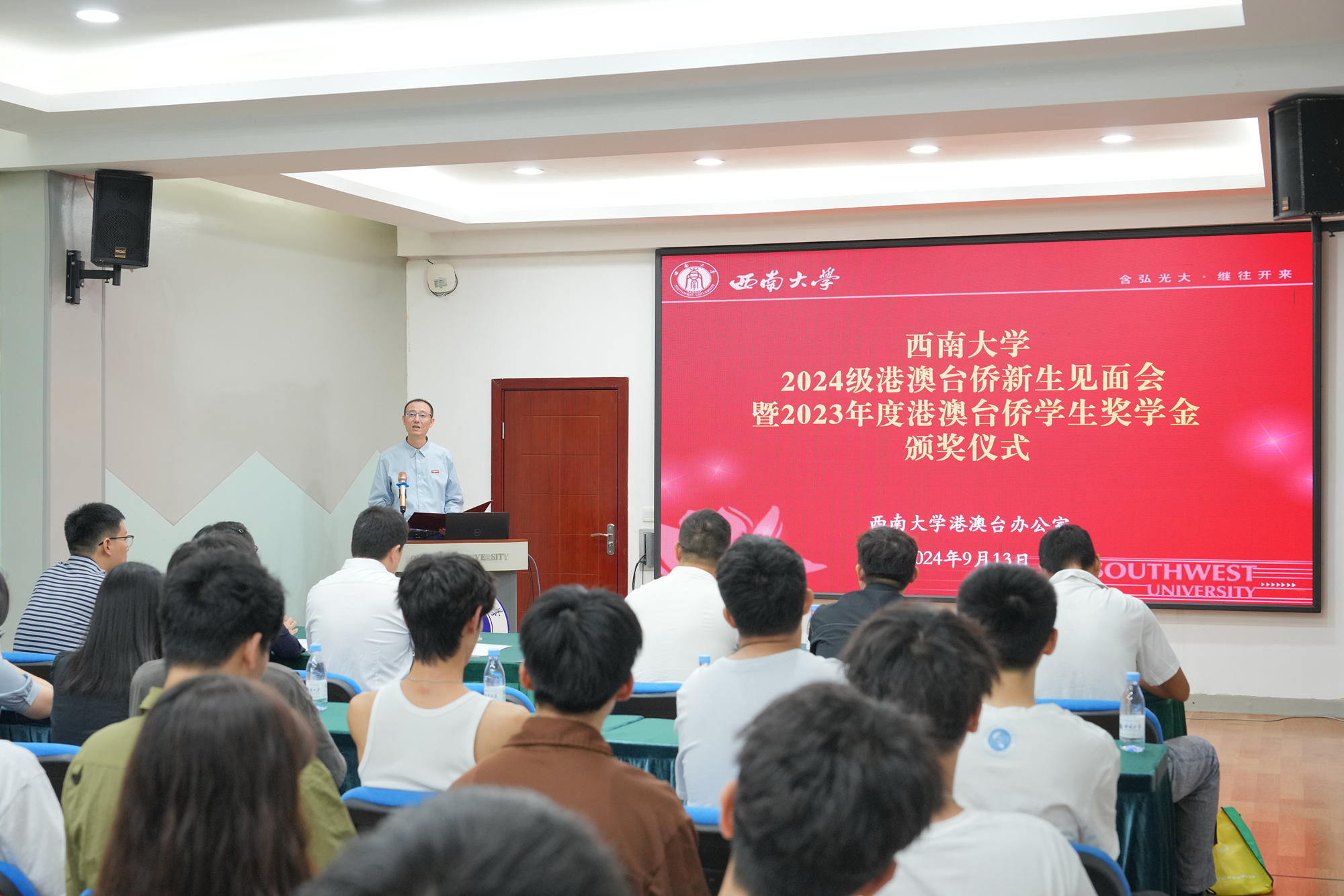 黄杰代表学校对2024级新生的到来表示热烈欢迎,对获得2023年度港澳台侨学生奖学金的同学们表示热烈祝贺。他简要介绍了学校与港澳台地区教育交流合作成效及在校港澳台侨学生基本情况,寄语同学们把握时代脉搏,明确发展定位,做担当有为的“西大人”;夯实学业基础,锤炼实践能力,做知行合一的“西大人”;培养创新精神,激发奋斗意识,做敢为人先的“西大人”。
