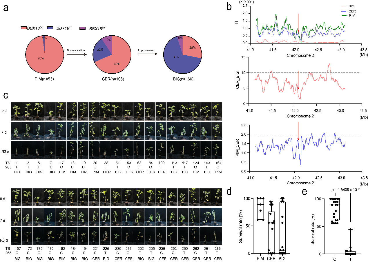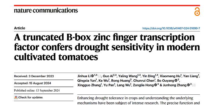 园艺园林学院园艺植物发育与逆境生物学创新实验室李金华教授团队联合华中农业大学张俊红教授团队于9月13日在国际知名期刊《自然通讯》(Nature Communications)上在线发表了题为“一个截短的B-box锌指蛋白降低现代栽培番茄的抗旱性”(A truncated B-box zinc finger transcription factor confers drought sensitivity in modern cultivated tomatoes)的研究论文。该论文从番茄种质(醋栗PIM,樱桃CER和大番茄BIG)进化上发现了一个对于抗旱十分重要SNP,该SNP会导致一个B-box锌指转录因子BBX18的提前终止并影响基因的转录活性。通过调查321份番茄种质资源核苷酸的多样性,发现该SNP突变在番茄进化过程中是自然形成的。进一步对不同种番茄资源进行耐旱性分析后,发现番茄的抗旱性是和该SNP的突变类型密切相关的。